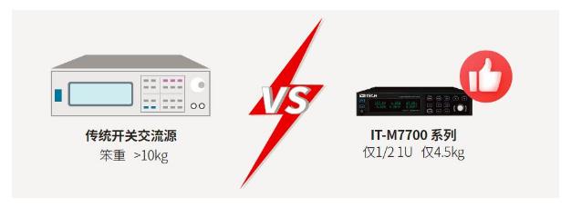 傳統交流電源通常體積較大,重量較重,不能輕易搬動。IT-M7700系列僅? 1U的體積內功率可達600VA,重量也僅有4.5kg,不到市面上同類型產品的一半。如此高功率密度的設計,不但增加了空間利用率,同樣適用于便攜及桌面測試,也是系統搭建的良好選擇。