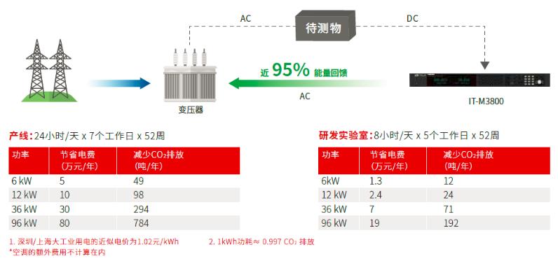 IT-M3800具有能量回收功能,可以將電能無污染的回饋電網,回饋最高可近95%。所有的回饋過程都是自動且安全的,IT-M3800配備了自動電網檢測系統,實時檢測相電壓、頻率用于電網同步。不但可以節省電力、暖通空調和制冷設施的成本,減少噪音,而且有助于減少碳排放,保護環境。
