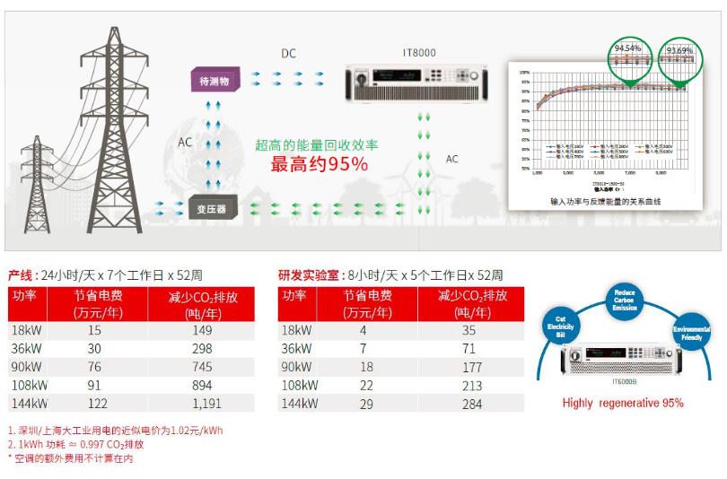 IT8000系列能量回饋式直流電子負載不同于能量消耗型的普通電子負載,其主要的特點是提供能量回收功能,可以回收電能然后廠內直接利用,而非以熱能的形式消耗掉。其轉換效率可約95%,不但大大降低了用戶的用電成本,同時也避免使用空調或昂貴的制冷系統,減少噪音。