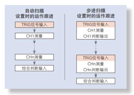 使用多路掃描器單元Z3003進(jìn)行掃描測量時(shí)候,可對應(yīng)檢查內(nèi) 容,選擇步進(jìn)掃描或者自動(dòng)掃描。 掃描結(jié)束后,只需要綜合判斷結(jié)果時(shí)選擇自動(dòng)掃描很方便。 使用EXT I/O進(jìn)行實(shí)時(shí)判斷時(shí)選擇步進(jìn)掃描很方便。