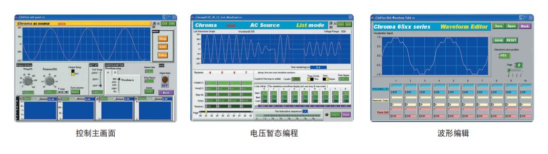 6500系列除了能編輯電壓、頻率輸出外,它還能有效地模擬各種電源中斷情形。通過STEP模式和PULSE模式,為用戶提供簡單易行的方式,來實現輸出參數逐步或連續的變化,輸出電壓的幅度、頻率、相位、波形等也可以通過對儀器內的內部觸發或外部觸發的控制來輸出。因此很容易模擬各種電源瞬間斷電、突波、雜訊、緩升等特性。這特性在實際測試中尤為重要,例如當測試產品在90度開機時訓試產品的最大涌浪電流可當測試產品在交流輸入突然有突波產生時觀客產品的特性。跳變瞬舊草式使得產生波形的能力事進一步。通過觸發器控制可與程序的靜態時間一到沒有電腦干擾時,可準確運行多達40種輸出排列程序,電網電壓的跳變,失真的模擬完全符合IEC61000-4-11的測試規范。
