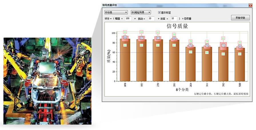 是我們給上海通用汽車做的節點信號質量測試軟件,也可以通過分析每個焊接機器人CAN節點發出的波形,自動對其的最小電壓幅值、最大電壓幅值、信號幅值、波形上升沿時間、波形下降沿時間、信號時間進行綜合“評分”,然后通過柱狀圖來直觀顯示出每個CAN幀ID的信號質量。便于出廠和日常維護檢修。