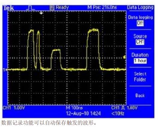 通過前面板上的USB主控端口,您可以把儀器設置、屏幕圖和波形數據保存到 U 盤中。內置數據記錄功能可以設置示波器,把用戶指定的觸發波形保存到U盤中,保存周期最長可達24小時。您還可以選擇 "Infinite" 選項,連續監測波形。通過這種模式,您可以把觸發的波形保存到外部 U 盤中,而沒有時間周期限制,直到存儲設備已滿。然后,示波器將引導您插入另一張U 盤,繼續保存波形。