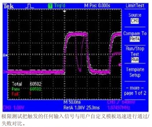 示波器可以自動監測源信號,判斷輸入波形是否位于預先定義的界限內,輸出通過或失敗結果。在違規時可以觸發具體操作,包括停止采集波形,停止極限測試功能,把失敗的波形數據或屏幕圖保存到 U 盤中,或上述操作的任意組合。這為需要迅速制訂決策的制造應用或服務應用提供了理想的解決方案。
