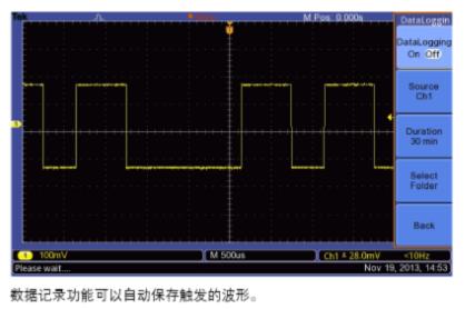前面板上的USB主控端口可以把儀器設置、截圖和波形數據保存到U盤上。這個端口還支持內置數據記錄功能,您可以設置示波器把最長24小時的用戶指定觸發波形保存到USB設備。您還可以選擇“Infinite”選項,連續監測波形。在無窮大模式下,您可以把觸發的波形保存到外部USB存儲設備上,沒有時間長度限制,直到存儲設備裝滿。然后,示波器將引導您插入另一個USB存儲設備,繼續保存波形。