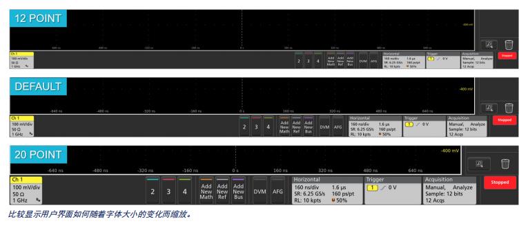 從歷史角度看,示波器用戶界面的設計采用固定的字體大小,以優(yōu)化波形和讀數(shù)的顯示。如果所有用戶均具有相同的查看偏好,則可很好實現(xiàn),但這不切實際。用戶耗費大量時間盯著屏幕,泰克意識到了這一點。 4 系列 MSO 為用戶提供可調(diào)字體大小的偏好設置;最小 12 號字,最大 20 號字。調(diào)整字體大小時,用戶界面動態(tài)縮放,因此您可以輕松地選擇適用于您的應用的最佳大小。