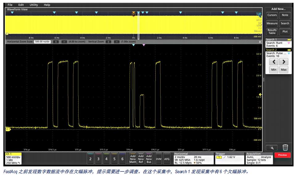 如果想調(diào)試設計問題,首先必須知道存在問題。數(shù)字熒光技術(shù)及 FastAcq 讓您更深入地了解器件的實際運行狀況。其快速波形捕獲速率(>500,000 個波形/秒)提高了查看數(shù)字系統(tǒng)中常見偶發(fā)問題的概率,如欠幅脈沖、毛刺、定時問題等。為進一步增強查看偶發(fā)事件的能力,輝度等級指明了偶發(fā)瞬態(tài)信號相對于正常信號特點發(fā)生的頻次。