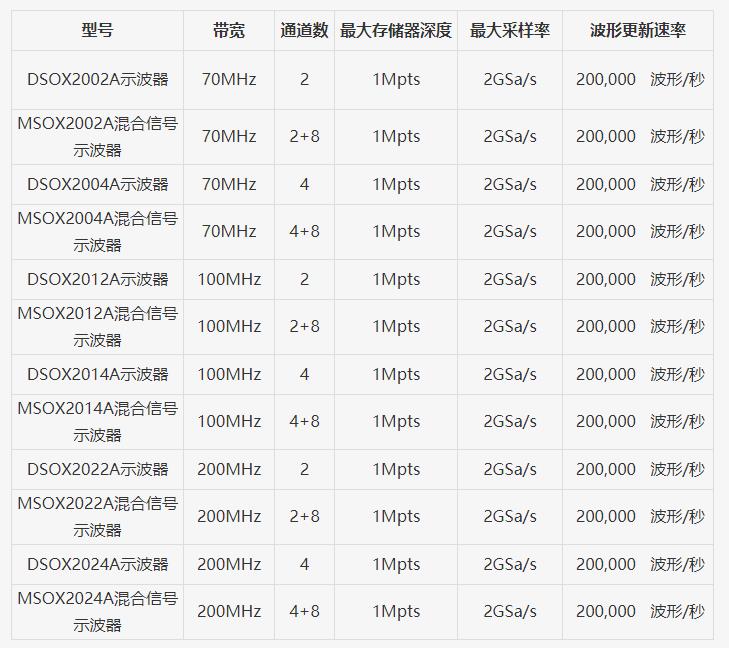 DSOX2000A系列選型參數表