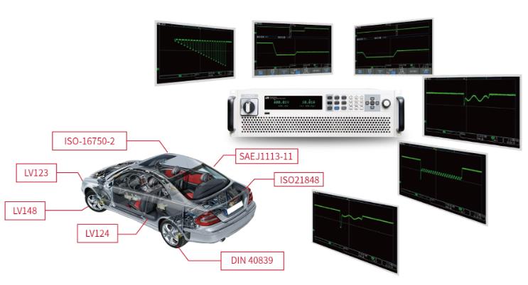 汽車電子設備在汽車啟動和運行過程中可能經常遇到電源瞬變的干擾, 為確保被測件能夠經受得住這些實際瞬變,用戶需要在測試過程中仿真最壞情況功率瞬變條件。根據行業的相關標準IT6000B系列內置了LV123、LV148、DIN40839、ISO-16750-2、SAEJ1113-11、LV124 和ISO21848 標準汽車功率網用電壓曲線,用戶可直接調取出汽車啟動瞬間電壓跌落及多種汽車電子測試脈沖波形對相關的汽車電子產品進行性能測試,具有12V、24V 和48V 電壓等級可供選擇。